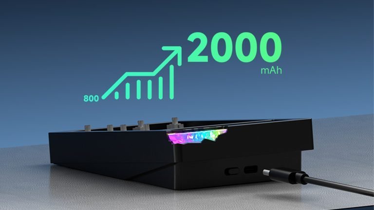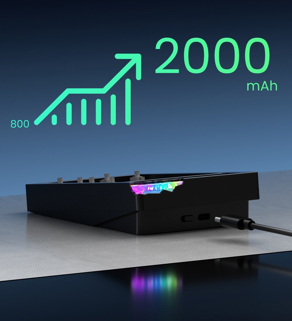 The keyboard is equipped with a 2000mAh built-in rechargeable lithium battery, providing extended wireless usage time across all connection modes. The battery supports charging via the USB Type-C interface during wired operation.
