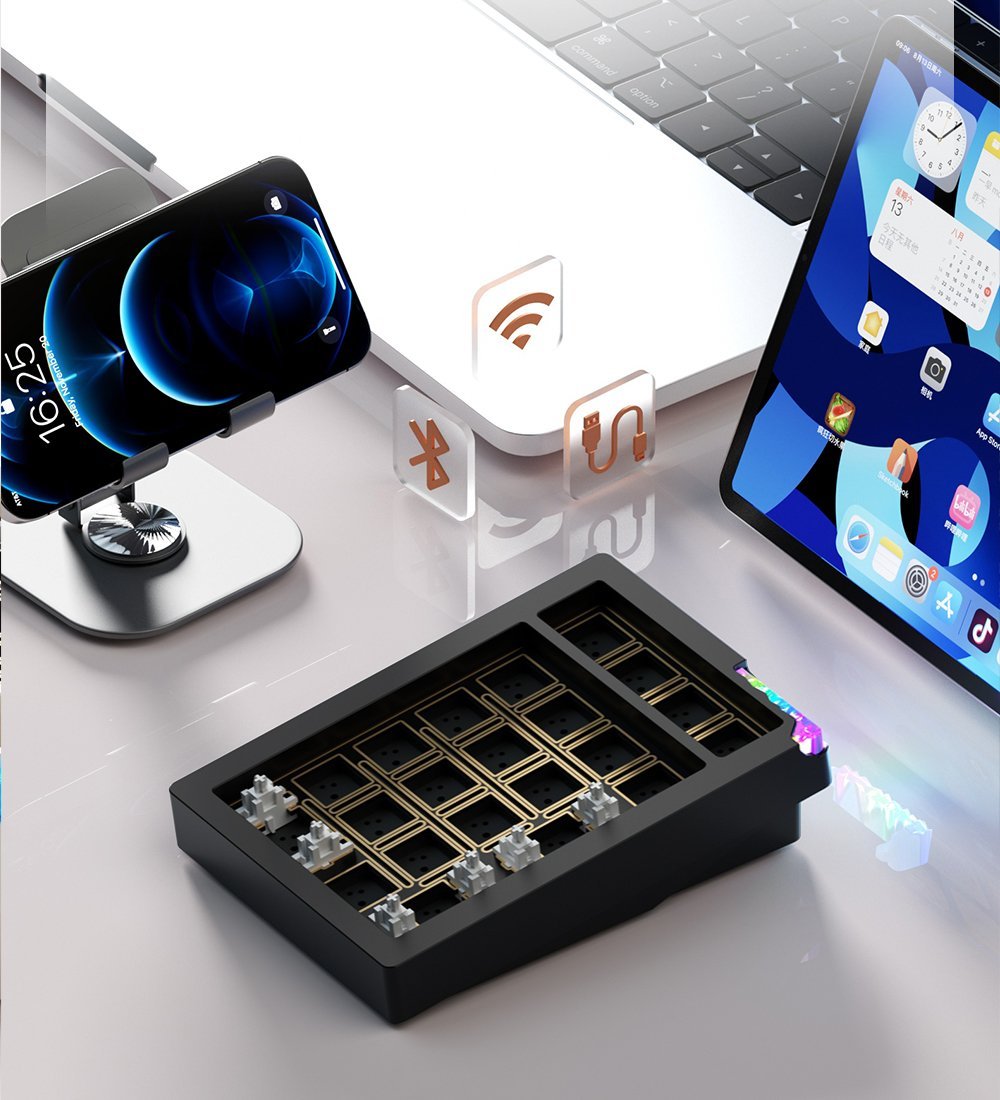 The keyboard supports three connection modes (2.4GHz wireless, Bluetooth, and USB Type-C wired) and is compatible with Windows, macOS, and Linux operating systems.