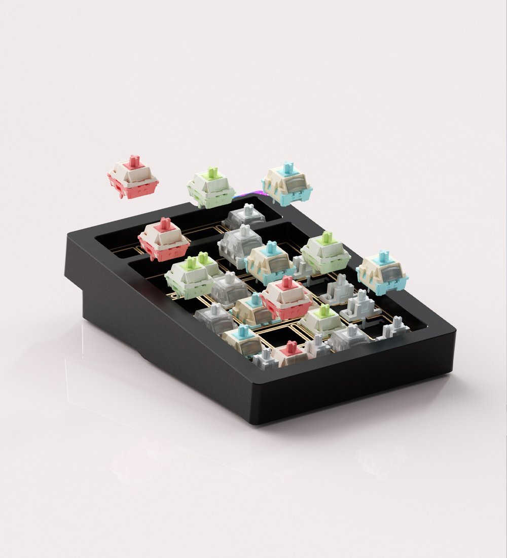 All keys support hot-swap socket mounting. The design accommodates both 5-pin and 3-pin mechanical switches, allowing for easy switch replacement and customization without soldering.