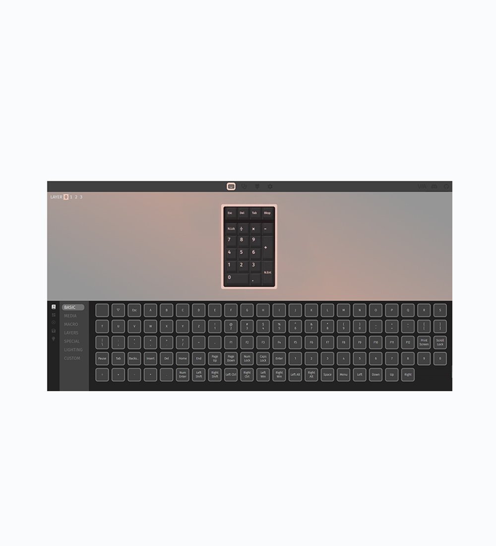 The keyboard features full support for QMK and VIA open-source firmware, enabling granular customization of all keys. Users can remap layouts, assign macros, configure shortcuts, and adjust RGB lighting effects via VIA's real-time interface.